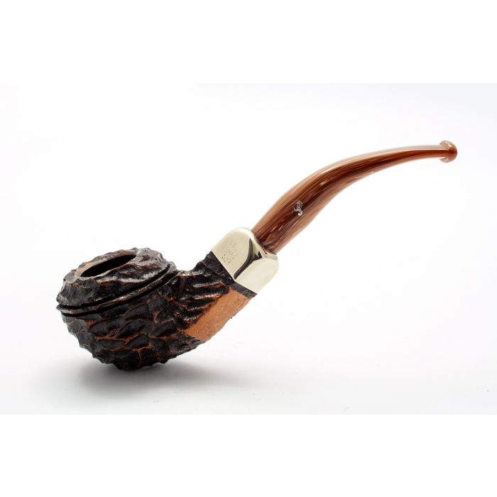 Peterson Derry Pfeifeim Half Bent Shape mit Vierkantholm und Silberolive. Das karamell-marmorierte Mundstück harmoniert perfekt mit dem braun rustizierten, relativ zierichen Bowl.