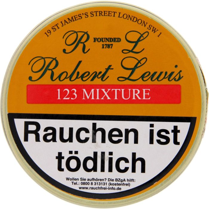 Robert Lewis 123 Mixture ist ein Pfeifentabak nach englischer Art und besteht hauptsächlich aus Latakia, Black Cavendish sowie rötlichem Virginia und Orient.