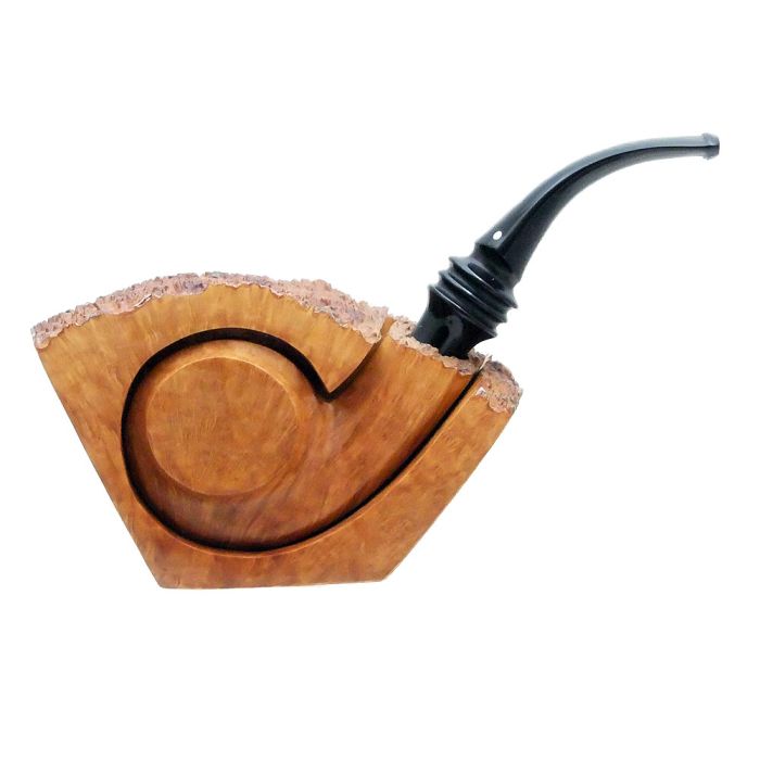 Diese feine, sowie ästhetische Pfeife weist eine nahezu perfekte 360° Flame Grain Maserung auf, die sich in einem Bogen bis hin zum Holmende ergießt. Sie wirkt beinahe schwerelos, im Gegensatz zu dem mächtigen Borkenkantel, aus dem heraus sie meisterhaft modelliert wurde. Sie weist keinerlei Spot-Kittstellen auf.