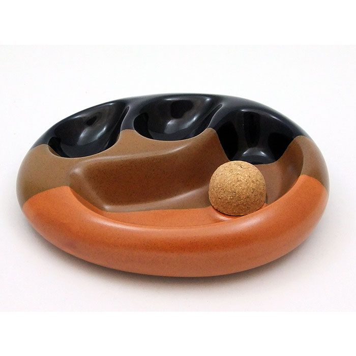 Keramik Pfeifenascher schwarz-braun, oval mit Klopfkorken und zwei Pfeifenablagen.