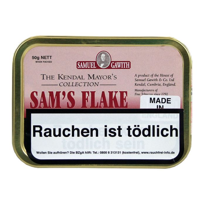 Samuel Gawith Sam's Flake besteht aus leichten, gepressten Virginias und türkischen Tabaken und wird abgerundet mit einem zarten Flavour der Tonkabohne.