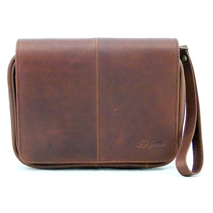 Pfeifentasche aus dunkelbraunen, genarbtem Leder im Used Look für vier Pfeifen mit Dosenfach und Stopferlasche. Überwurflasche mit zwei Staufächern und Magnetdruckknöpfen und 2 gegenläufigen Reißverschlüsse.
